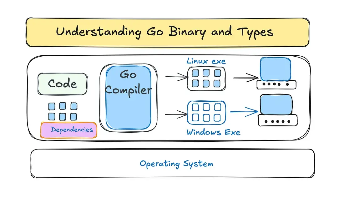 Setelah menulis kode, akan dicompile menggunakan go compiler dan akan menghasilkan binary file.